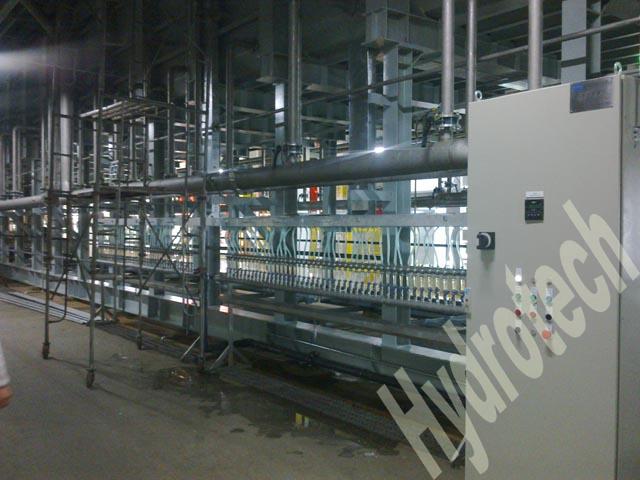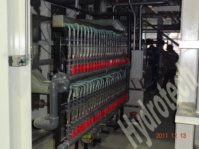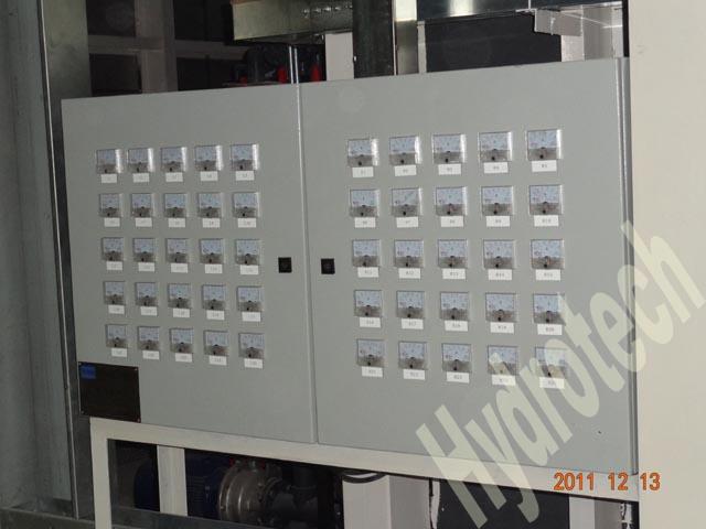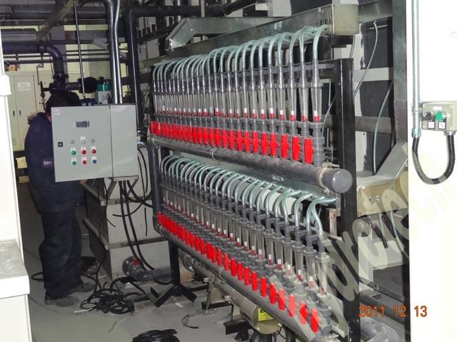 极液系统是由阳极组、流量计、球阀、进出水软管、极液循环泵、极液循环管路、电导仪、电磁阔、极液水箱、电控箱及纯水供给管路等组成。可根据用户要求提供电流表箱及流量计,以方便观察系统运行状况。